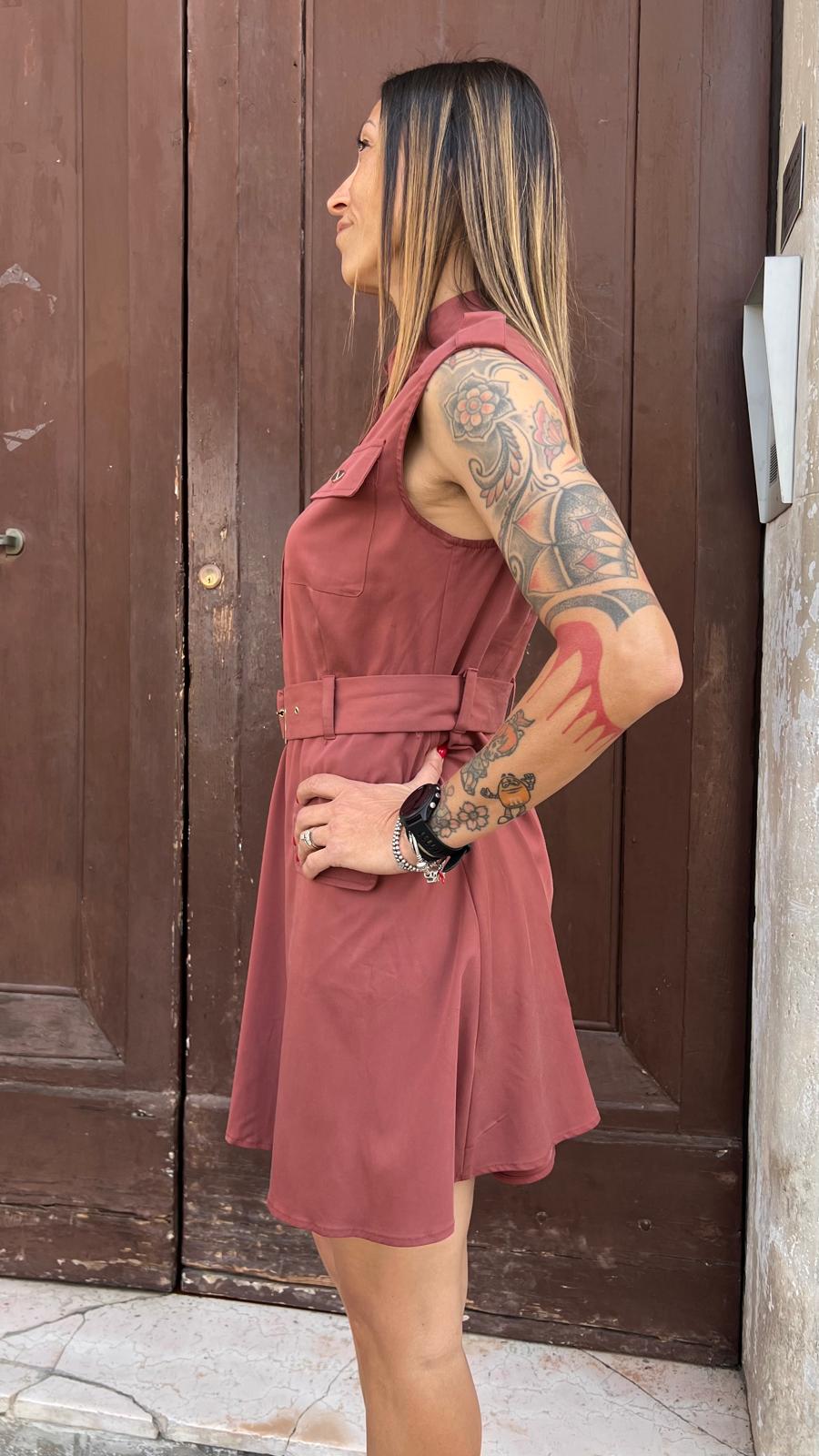 Abito corto smanicato con tasche e cintura con fibbia inclusa.