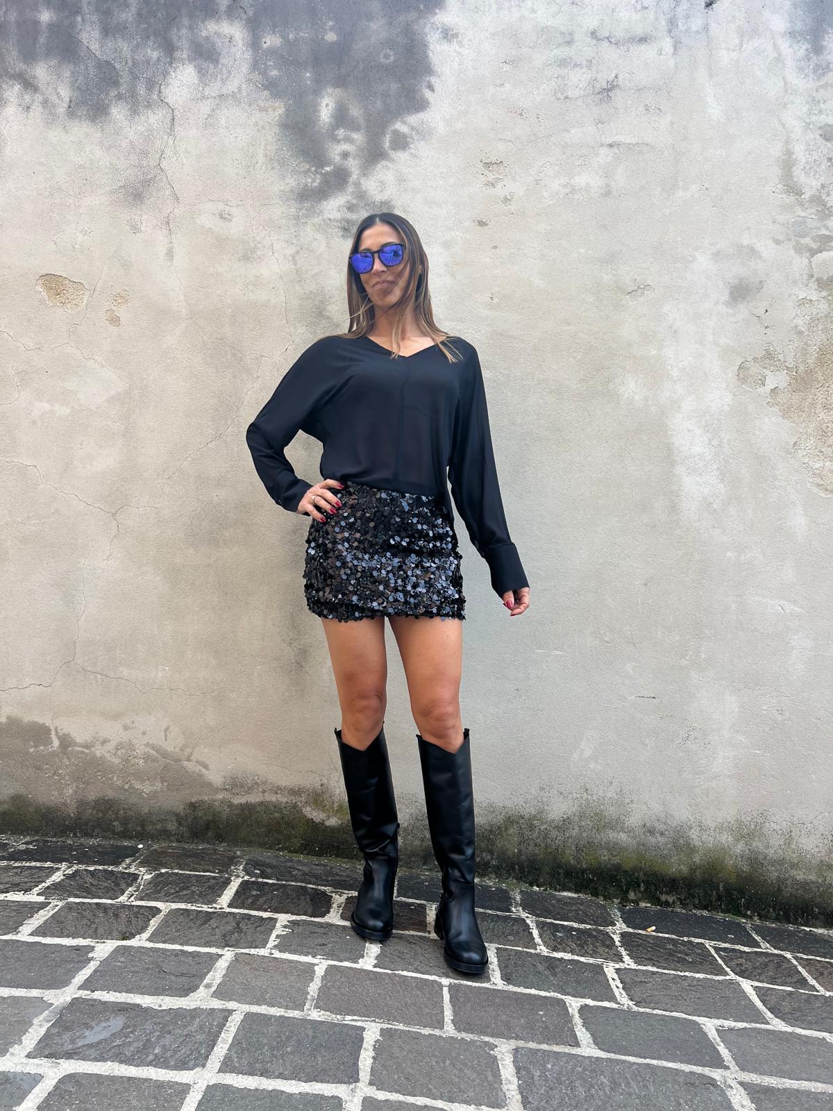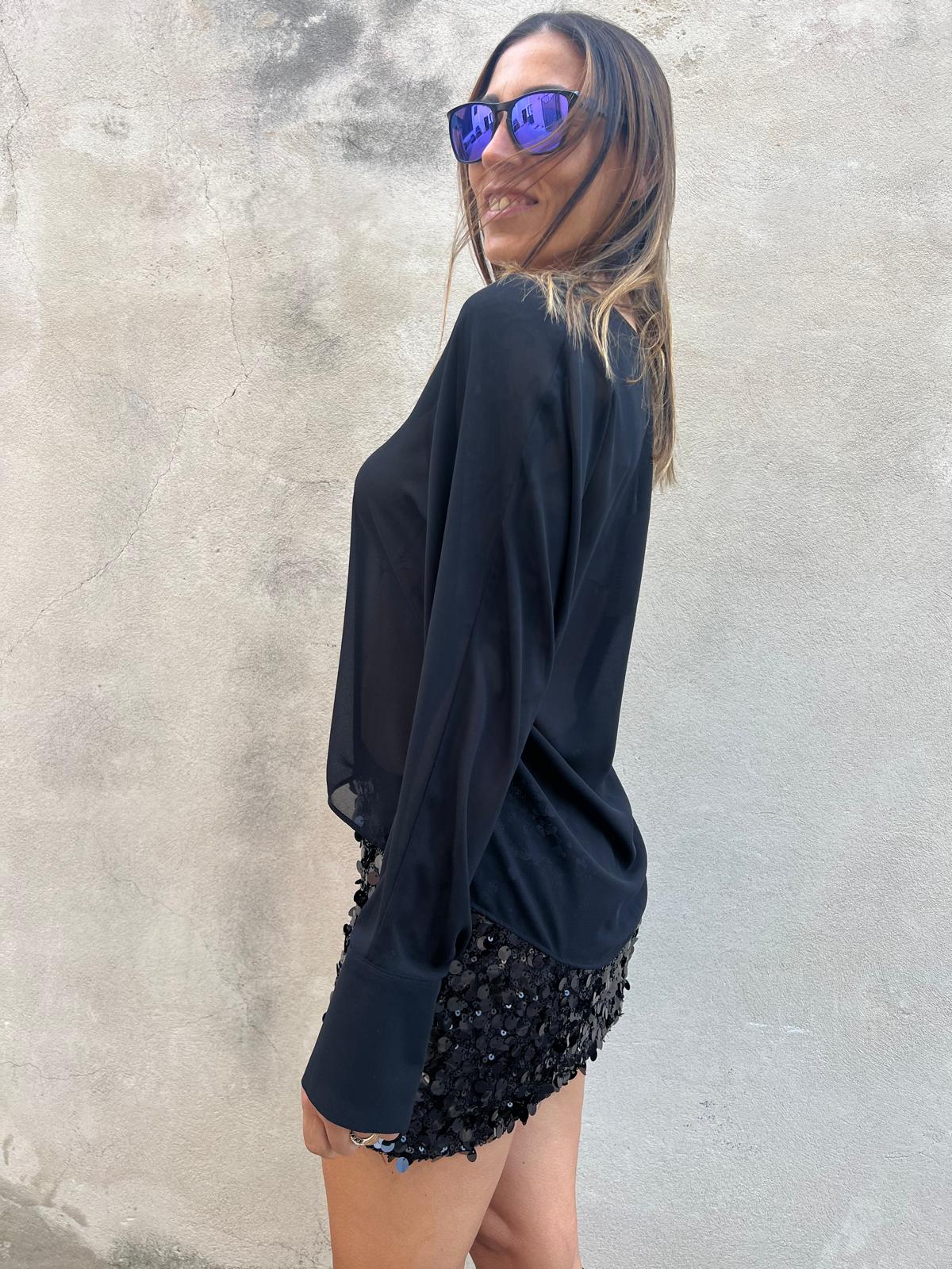 Vestito corto nero con. Parte superiore in tessuto morbido e semitrasparente con scollo a V, maniche a pipistrello e parte inferiore aderente con paillettes.