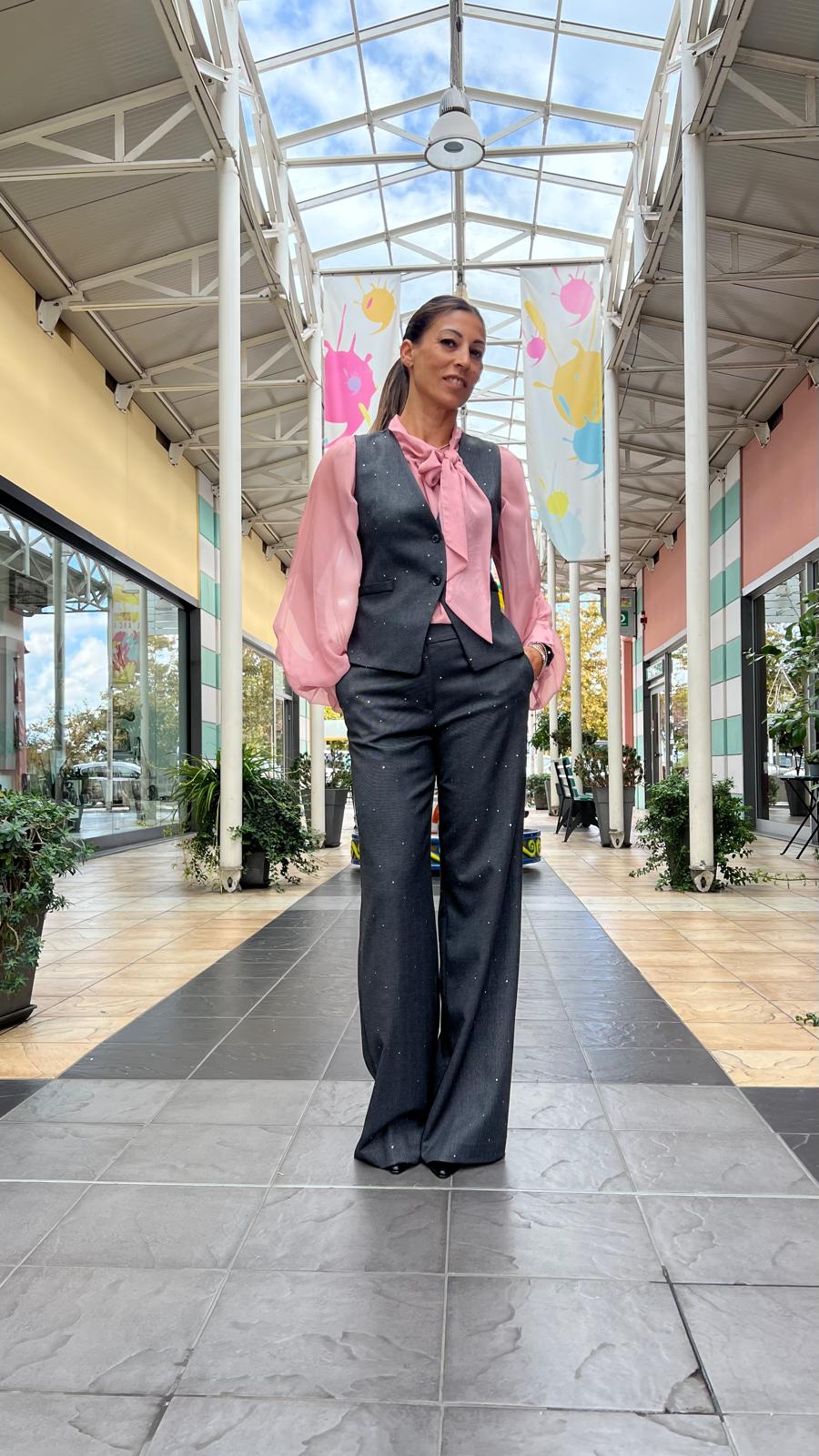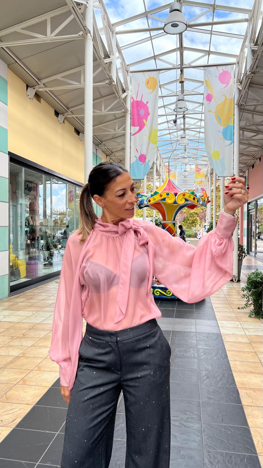 Camicia leggera e semi-trasparente, di colore rosa cipria. Presenta maniche lunghe a sbuffo con polsini arricciati a due bottoni e un colletto alto con un fiocco da annodare. La camicia ha un'estetica elegante e romantica.