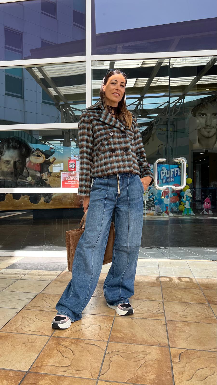 È realizzata in un tessuto con una fantasia a righe orizzontali che alterna i colori ruggine e turchese. Presenta una chiusura doppiopetto con due bottoni. Il fondo della giacca ha un orlo dritto e pulito. È un capo che suggerisce una scelta di stile per la mezza stagione o l'inverno.