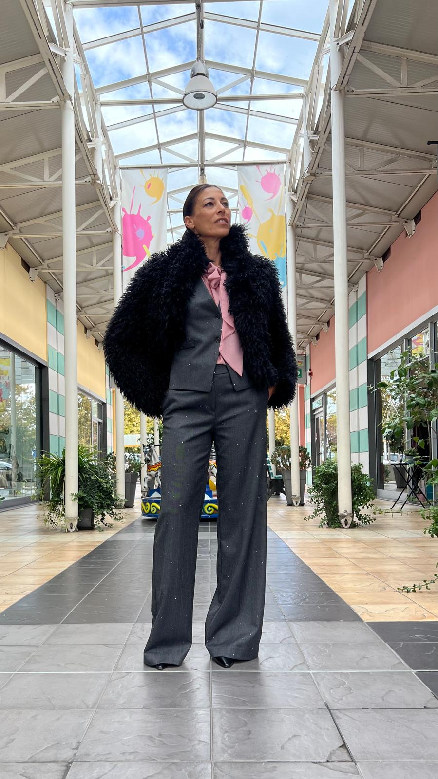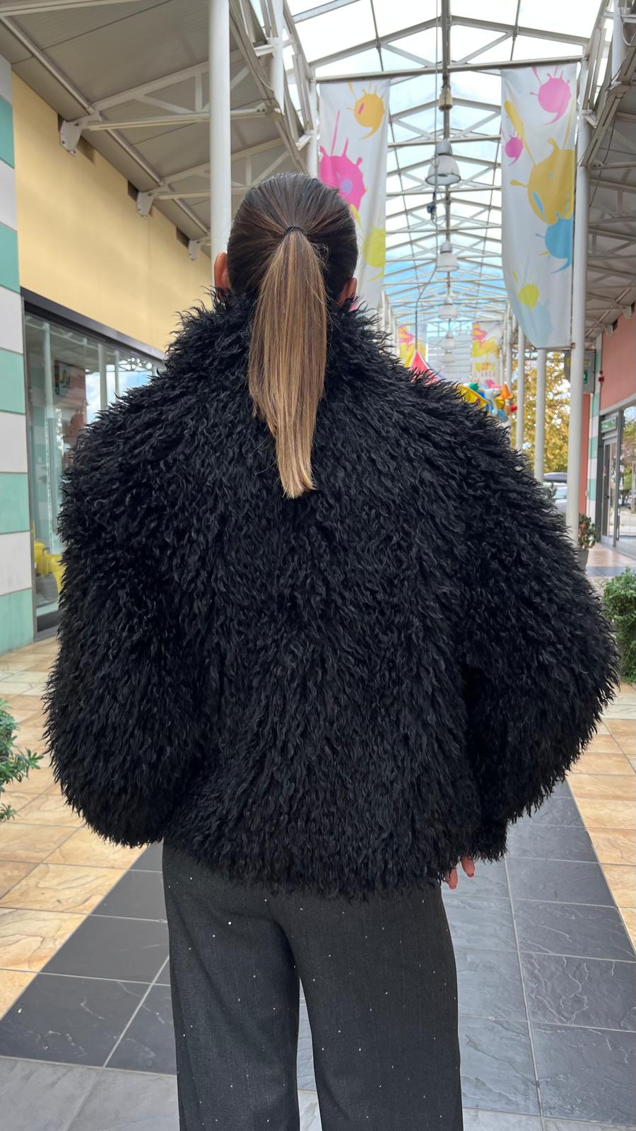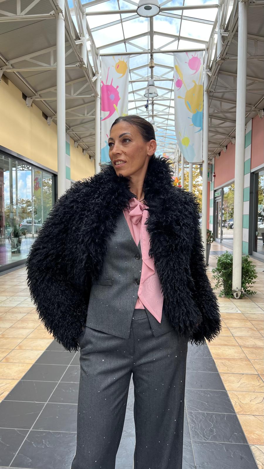 Pelliccetta ecologica, di colore nero, caratterizzata da un effetto "shaggy", con un taglio corto e voluminoso.