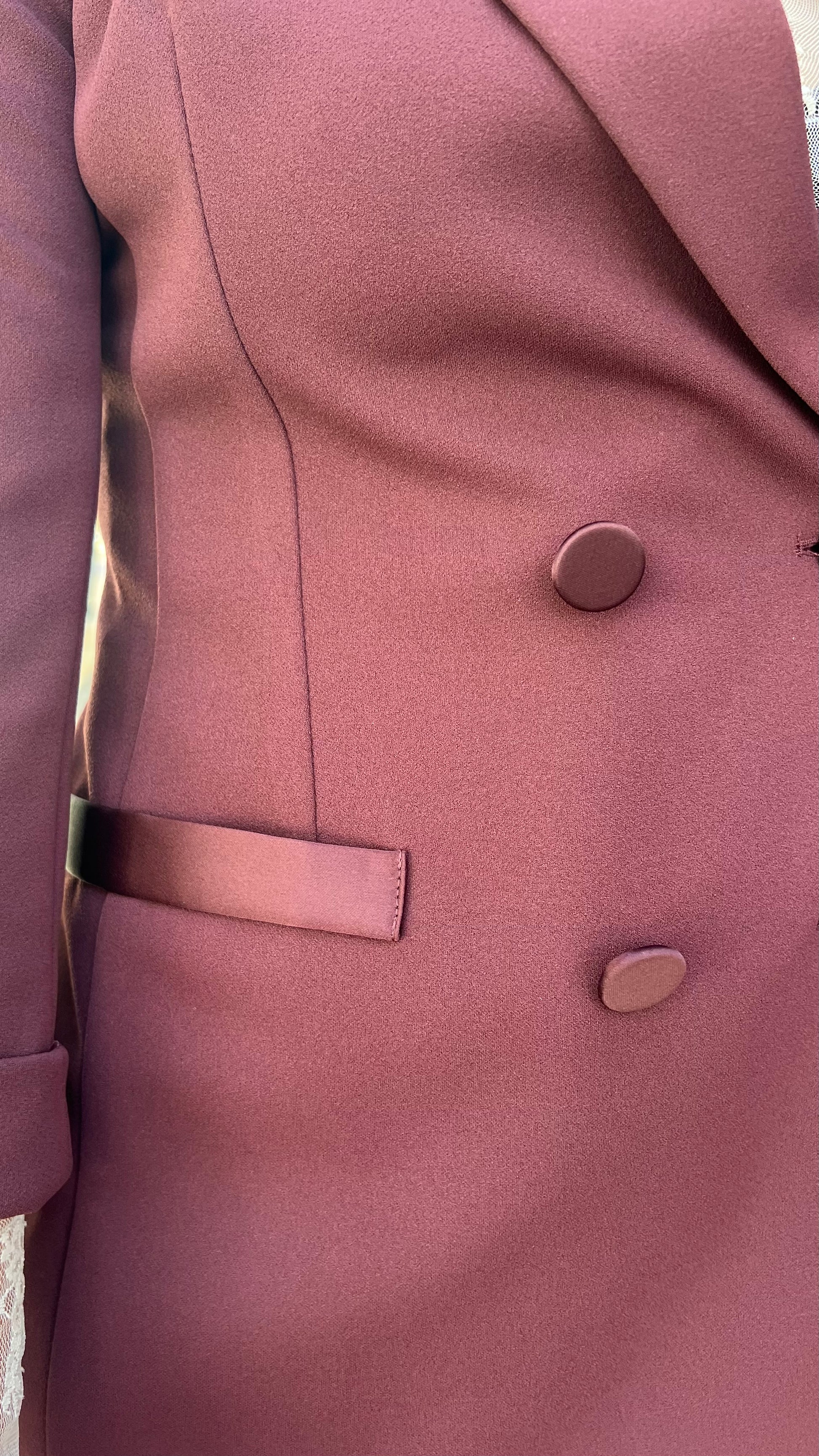Giacca doppiopetto avvitata in crepe elasticizzato, con bottoni e tasche in raso lucido , manica 3/4 .