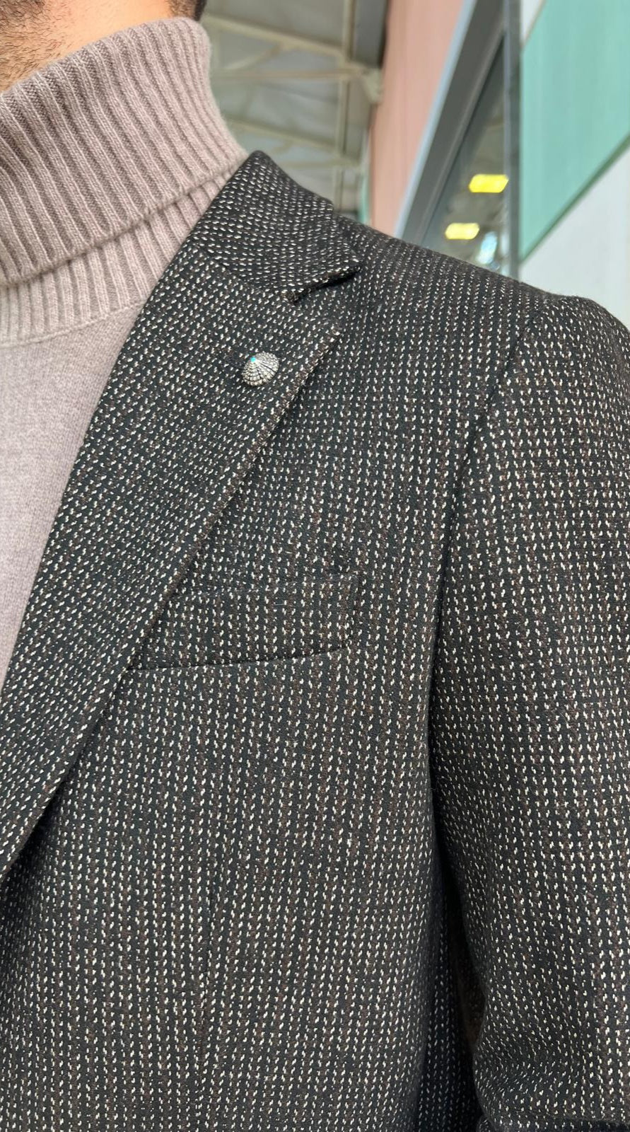 Blazer monopetto a micro-fantasia. Presenta una chiusura a due bottoni e tasche applicate sul davanti. Ha un taglio slim fit.