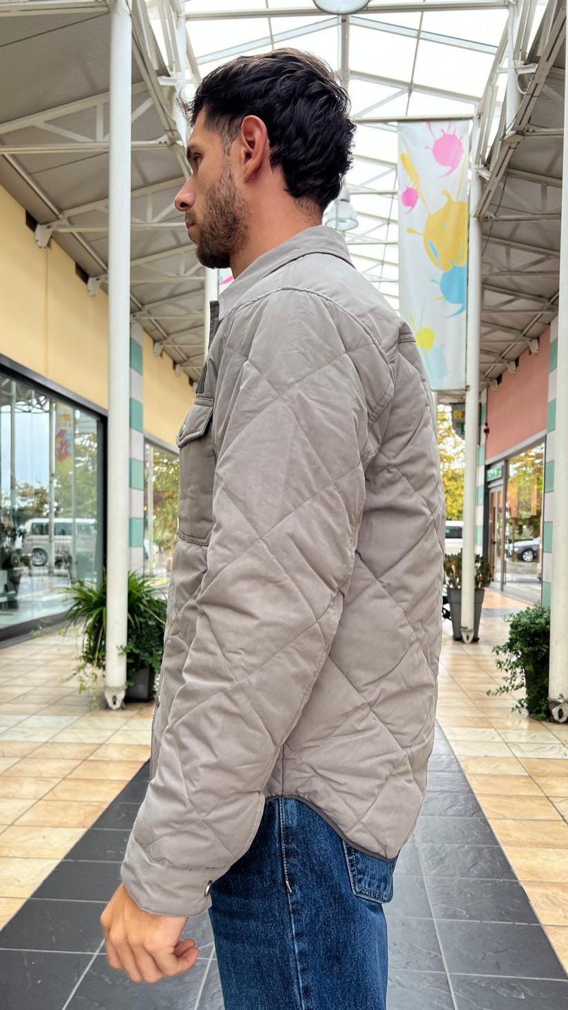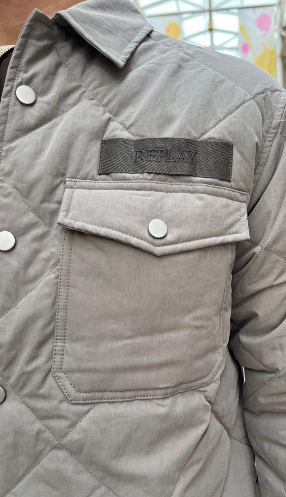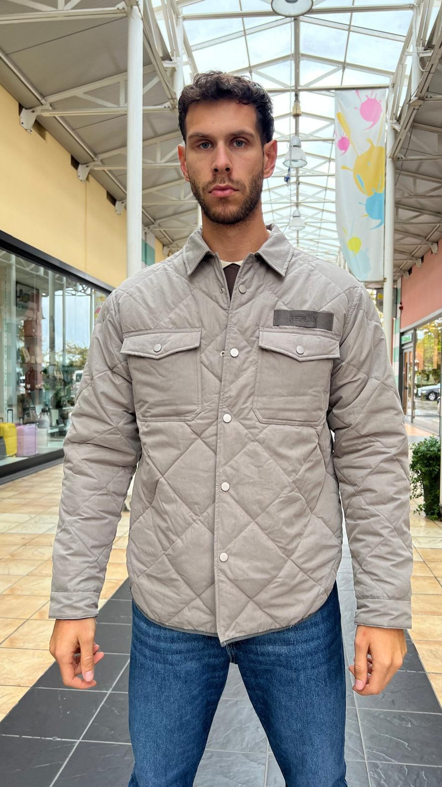 Giubbotto imbottito e foderato dalla vestibilità regolare caratterizzato da una trapuntatura a rombi e realizzato in misto cotone enylon dall'effetto crinkle. Il capo presenta un colletto a punta, due pratiche tasche con patta e bottone sul petto, polsini con bottone e un orlo stondato rifinito da un bordo a contrasto. Rifinisce il design l'iconica fettuccia Replay in stile militare sul petto. Chiusura frontale con bottoni a pressione.