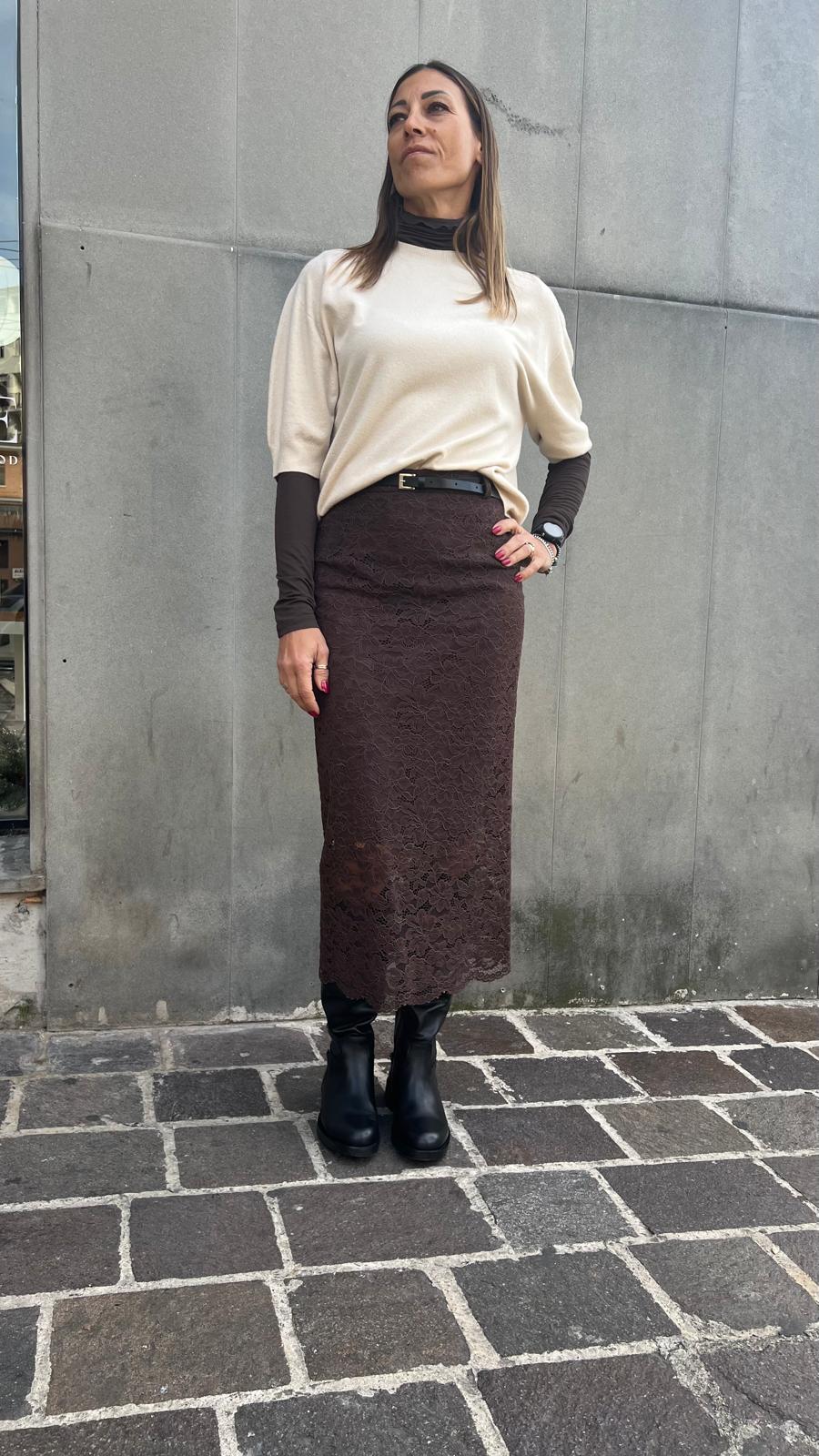 Gonna lunga in pizzo floreale rifinita con spacco e con una sottile cintura con fibbia in metallo.