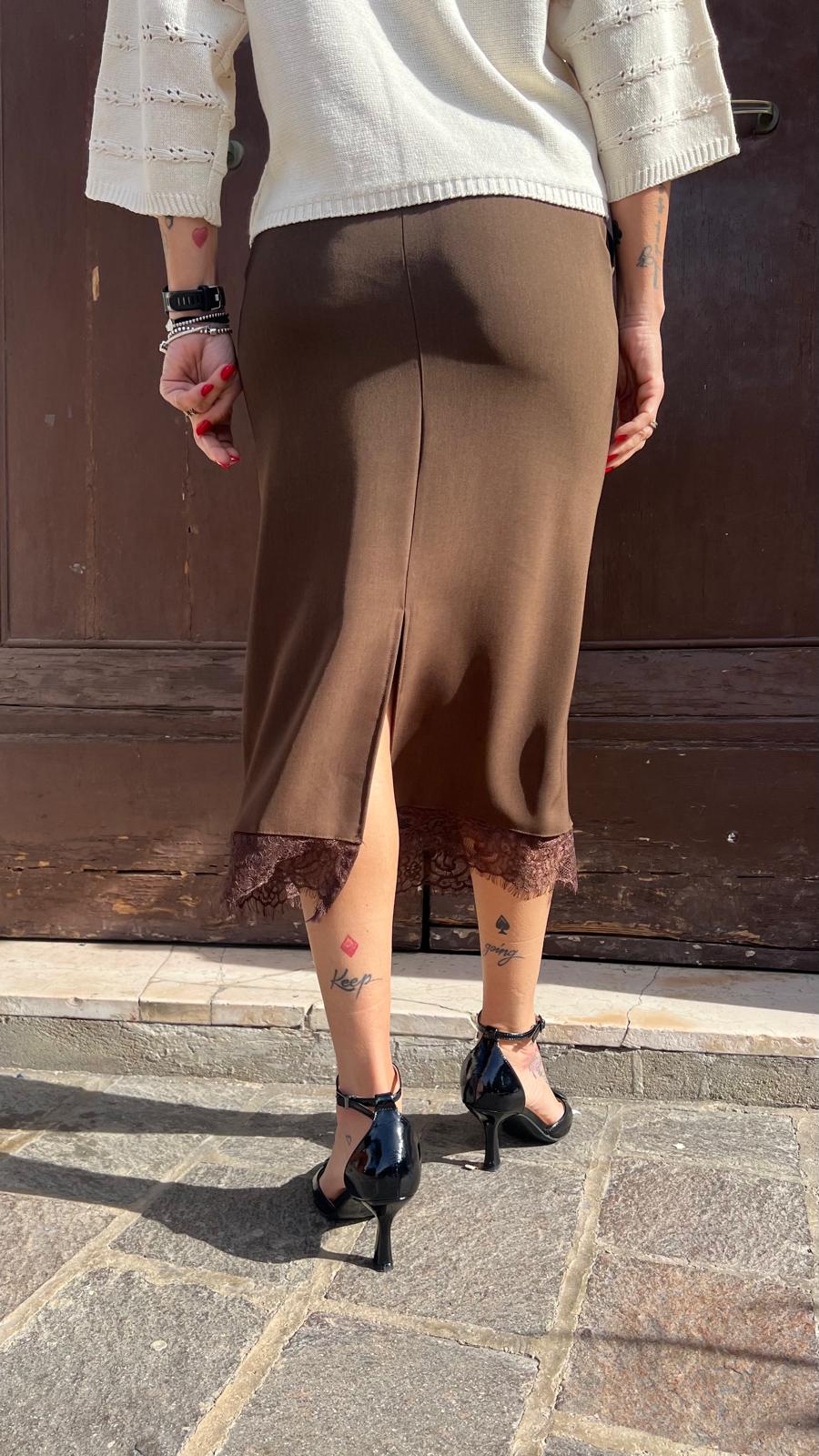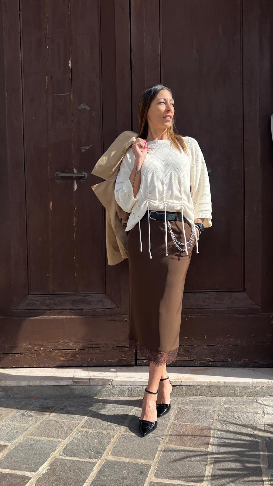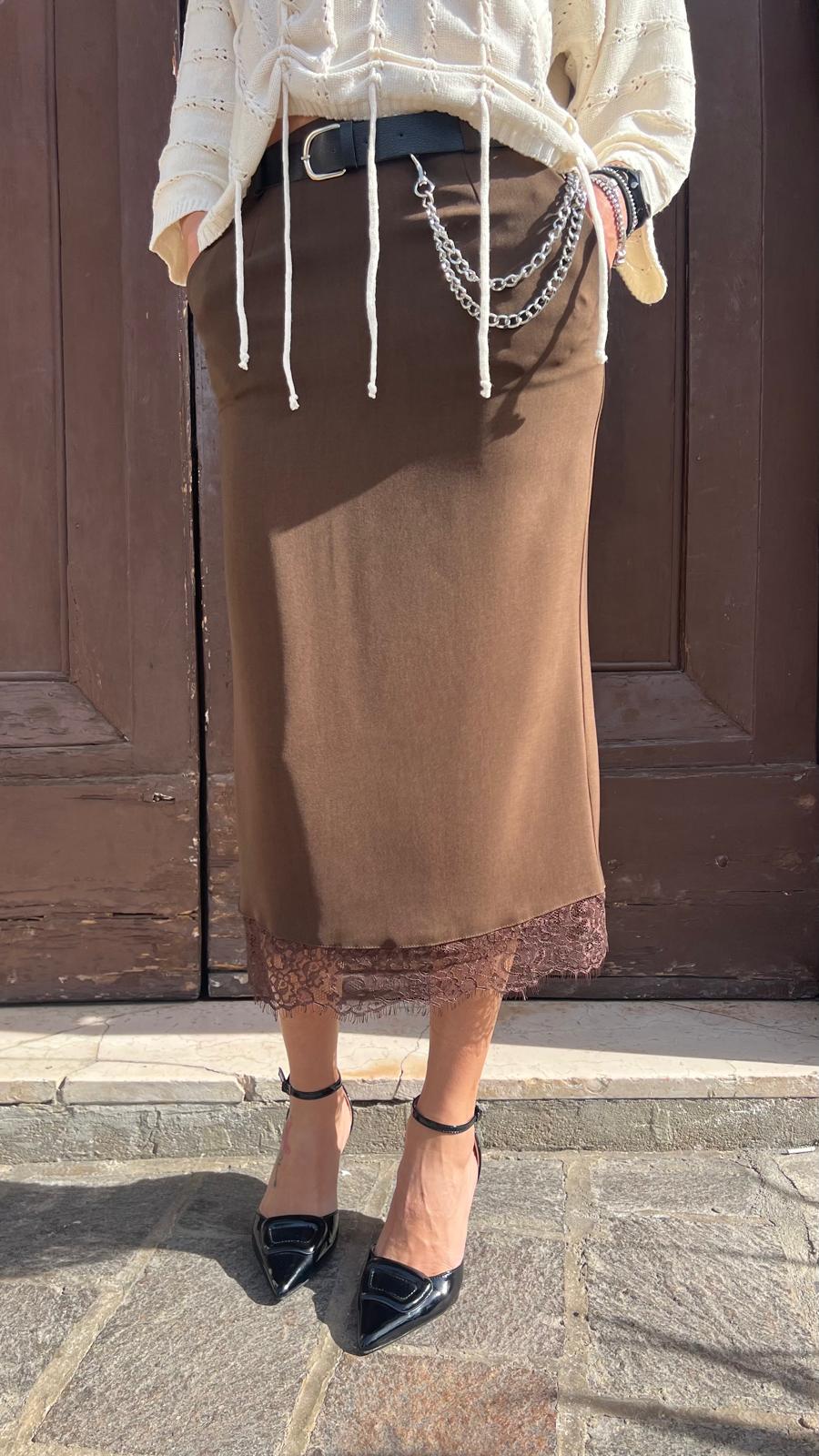 Gonna midi a tubino con spacco centrale posteriore. Bordo finale in pizzo e cintura con catene metalliche inclusa.