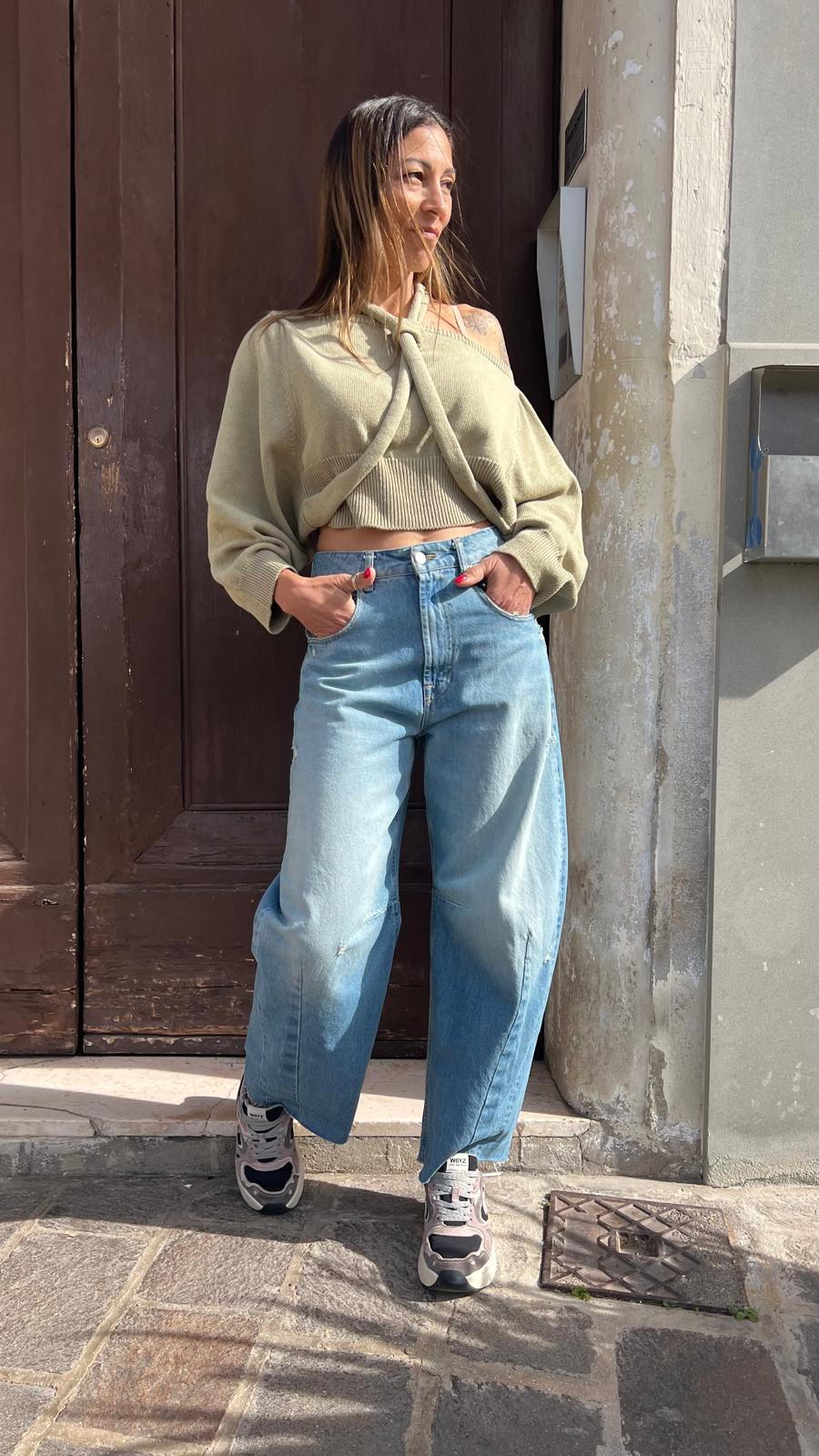 Maglia in filo scollo shiffer con dettaglio di nodo al collo. Modello corto con vestibilità comoda.
