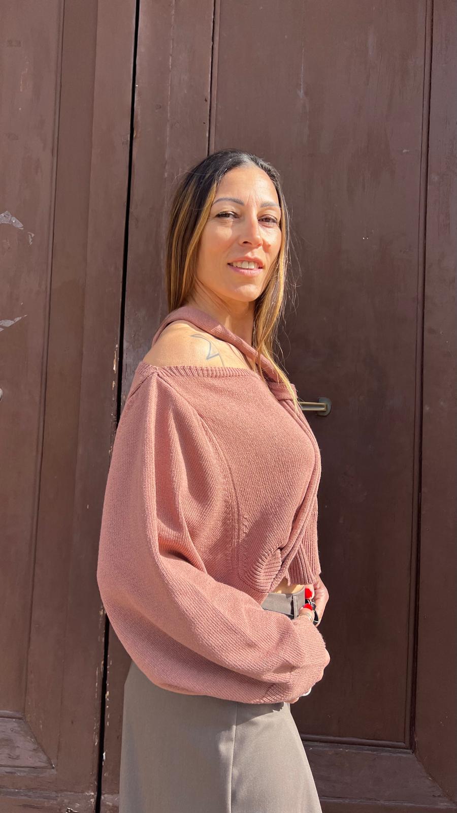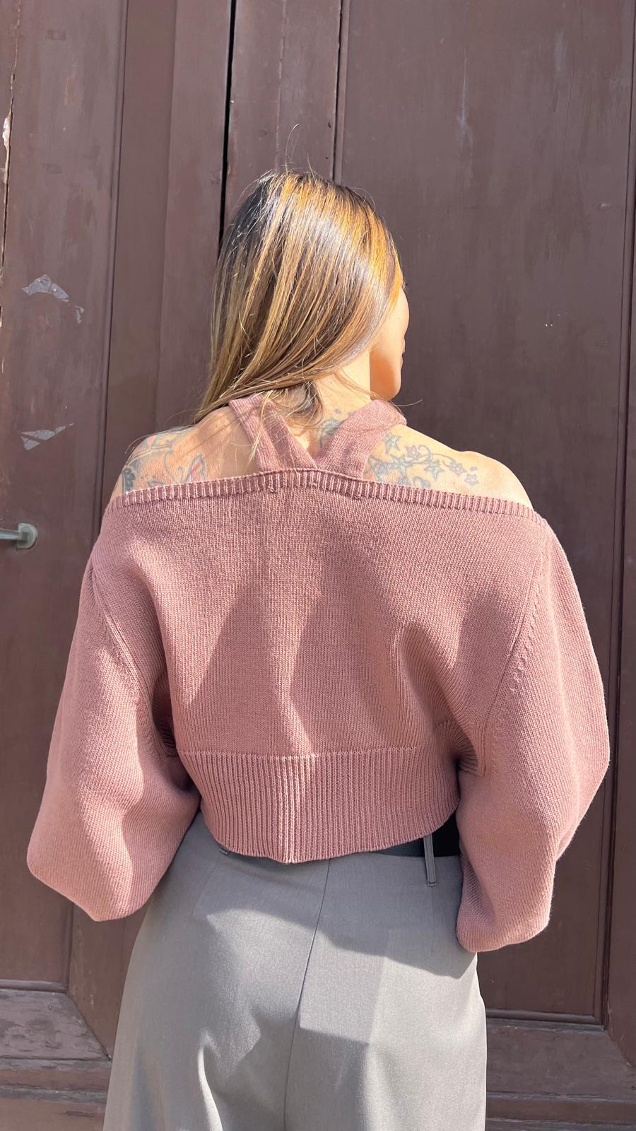 Maglia in filo scollo shiffer con dettaglio di nodo al collo. Modello corto con vestibilità comoda.