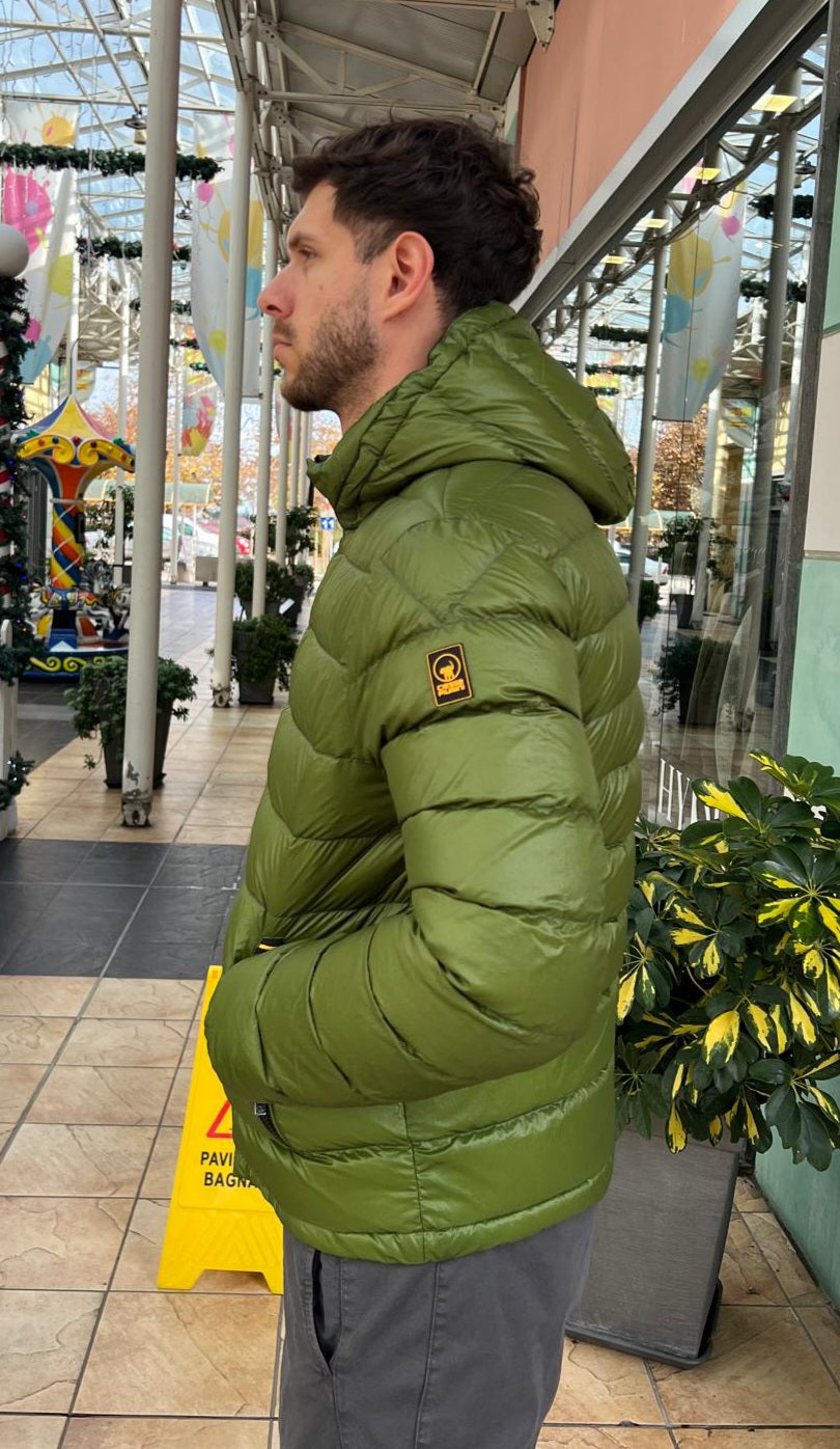 Piumino con imbottitura in vera piuma ideale per attività sia urban che outdoor. Realizzato in nylon wet dall’effetto lucido e trattato DWR, è dotato di cappuccio staccabile, fondo regolabile e polsini elasticizzati per offrire maggiore protezione e comfort.