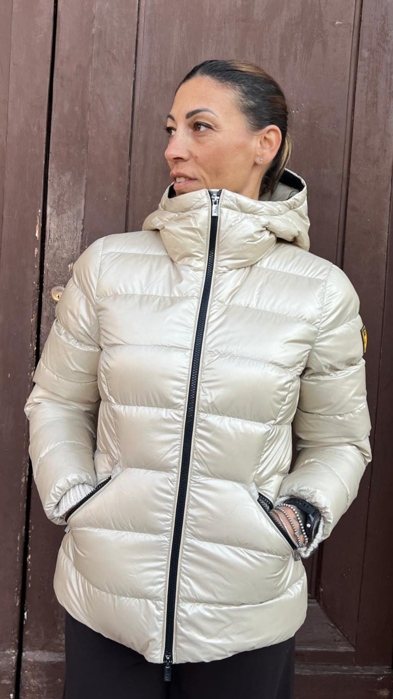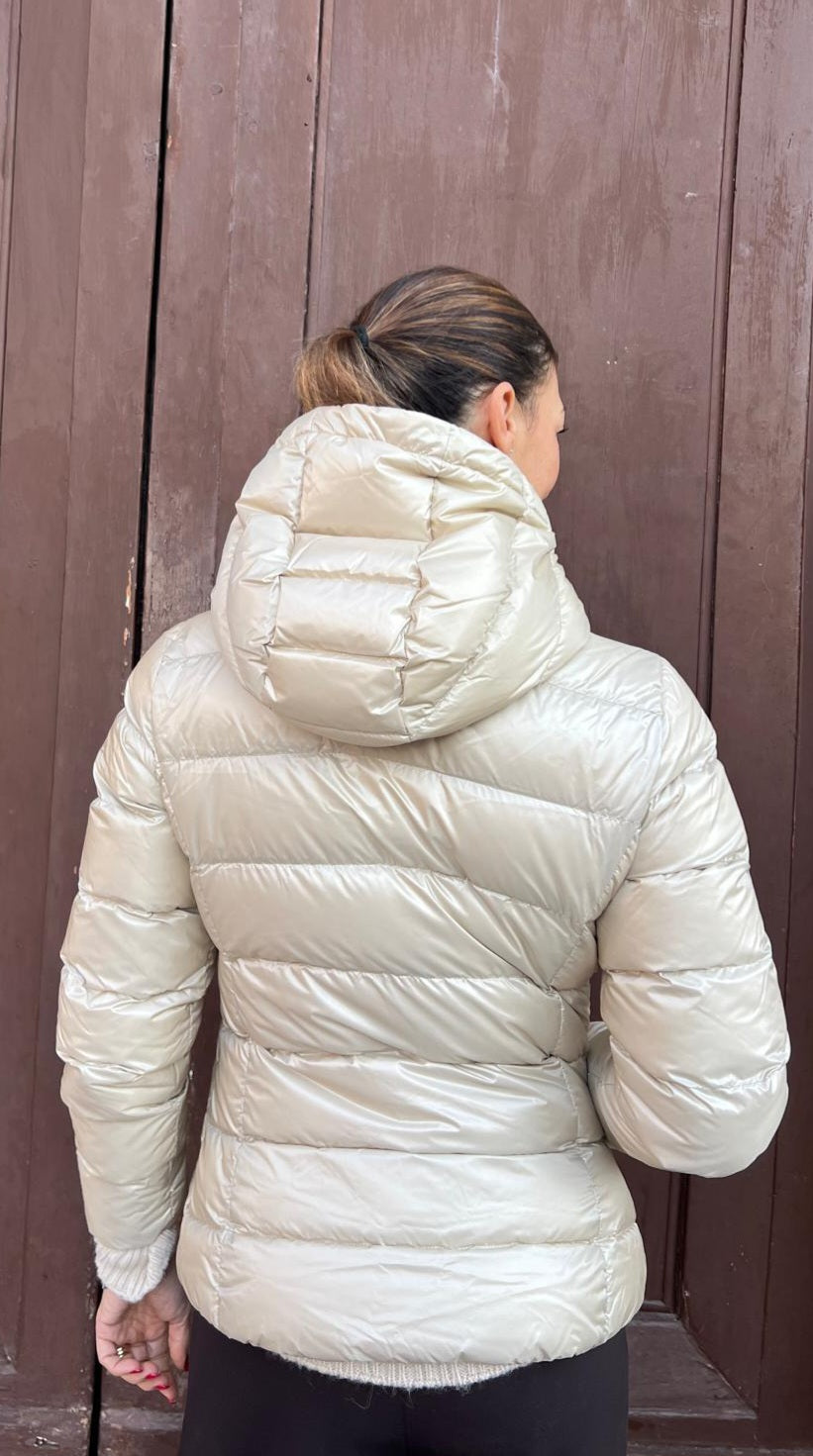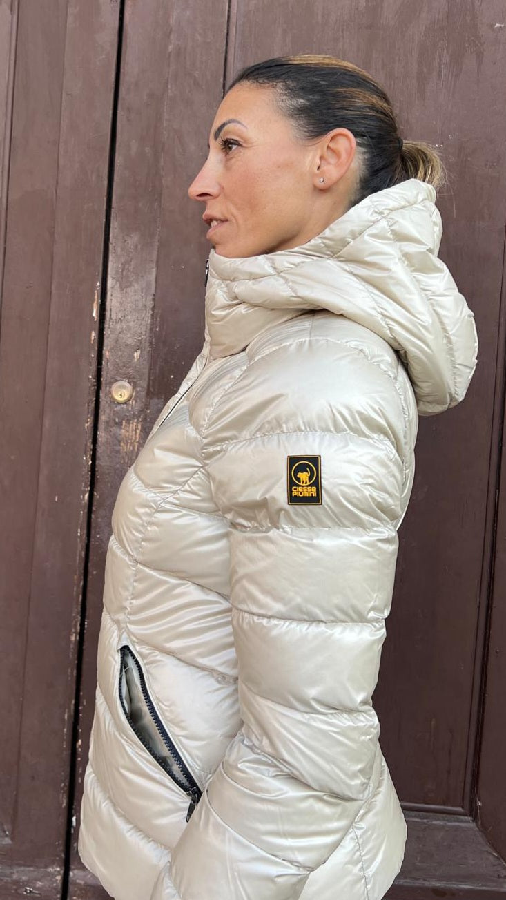 Piumino 200grammi con cappuccio fisso, realizzino tessuto lucido e imbottito con vera piuma, sinonimo di leggerezza e alto isolamento termico. Il taglio in vita scolpisce la silhouette.