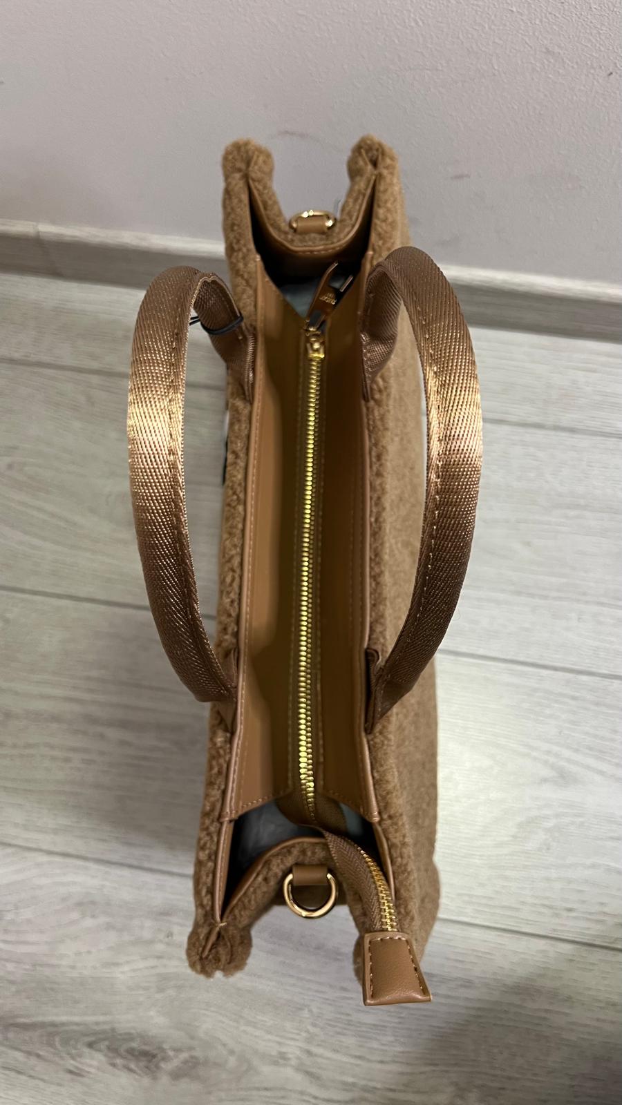 La borsa tote bag caratterizzata da un rivestimento esterno in un materiale soffice e peluche di colore cammello,