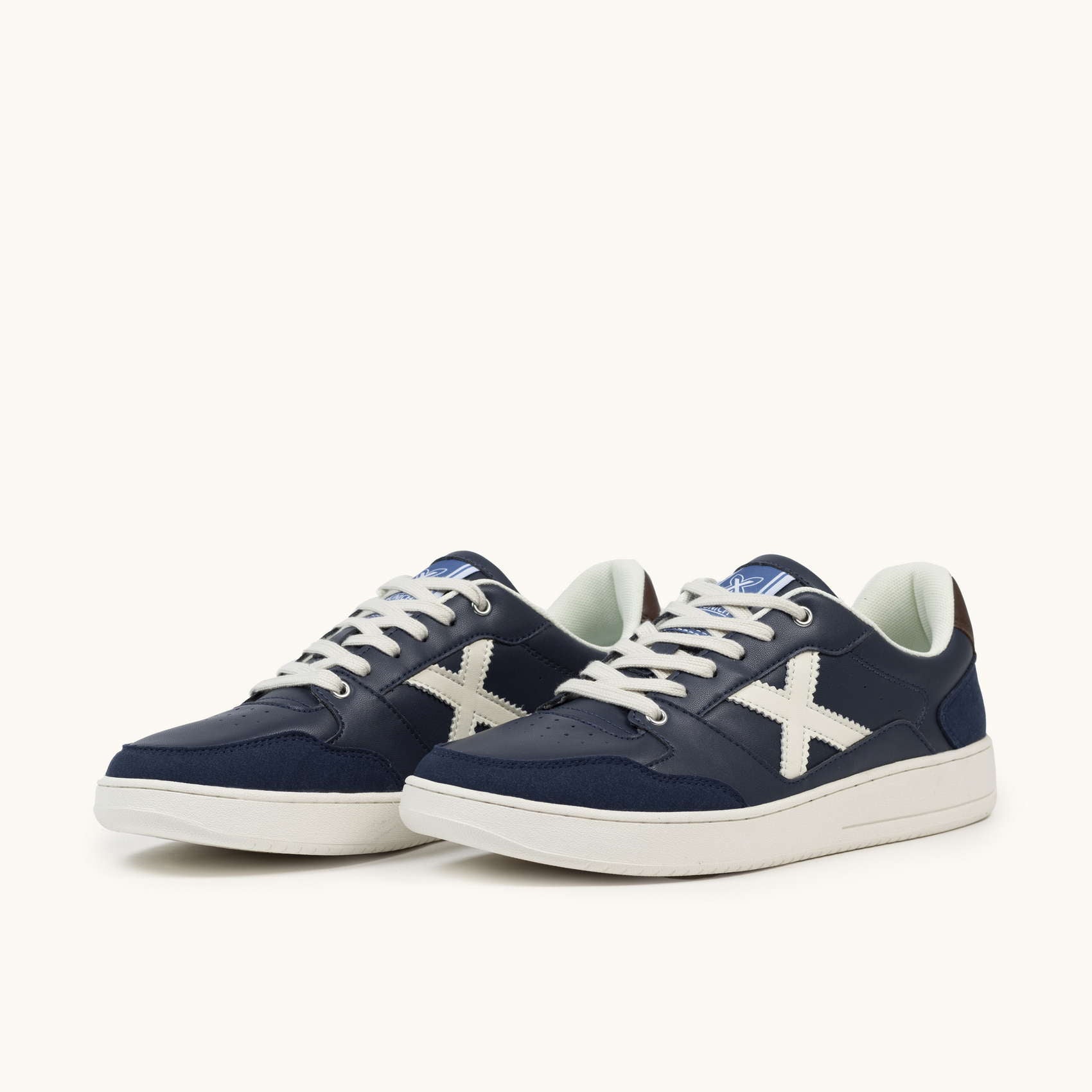 Sneaker dal design classico e sportivo, con un'estetica. La tomaia è prevalentemente di un intenso blu navy, realizzata con sezioni in pelle liscia e altre in pelle scamosciata, in particolare sul tallone e intorno al puntale.