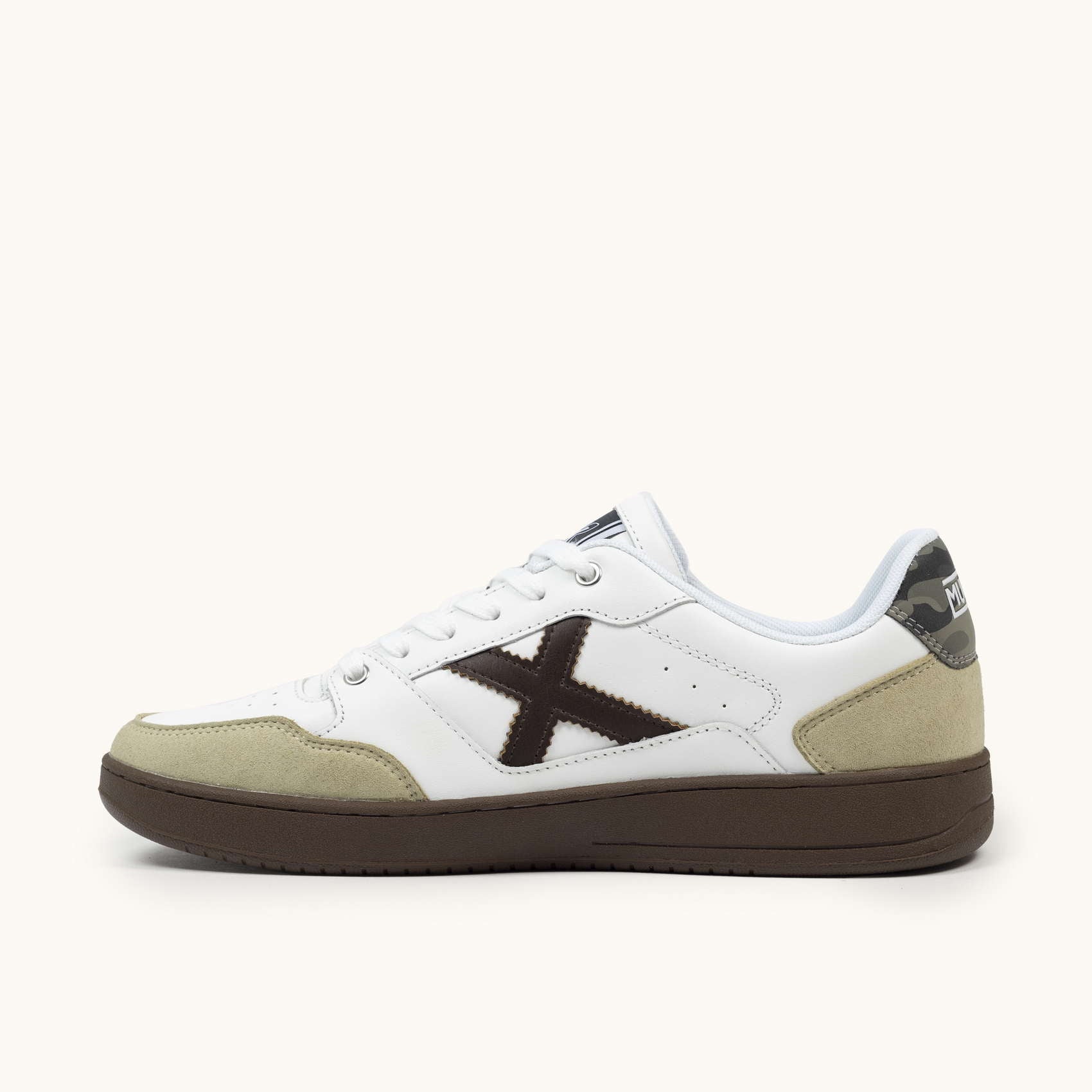 Lo stile generale è quello di una scarpa da ginnastica dal taglio classico e lifestyle, che si ispira ai modelli sportivi vintage ma con un tocco contemporaneo dato dal mix di materiali e dal motivo mimetico sul tallone. La combinazione di bianco, marrone e beige rende la scarpa facilmente abbinabile e adatta ad un look casual.