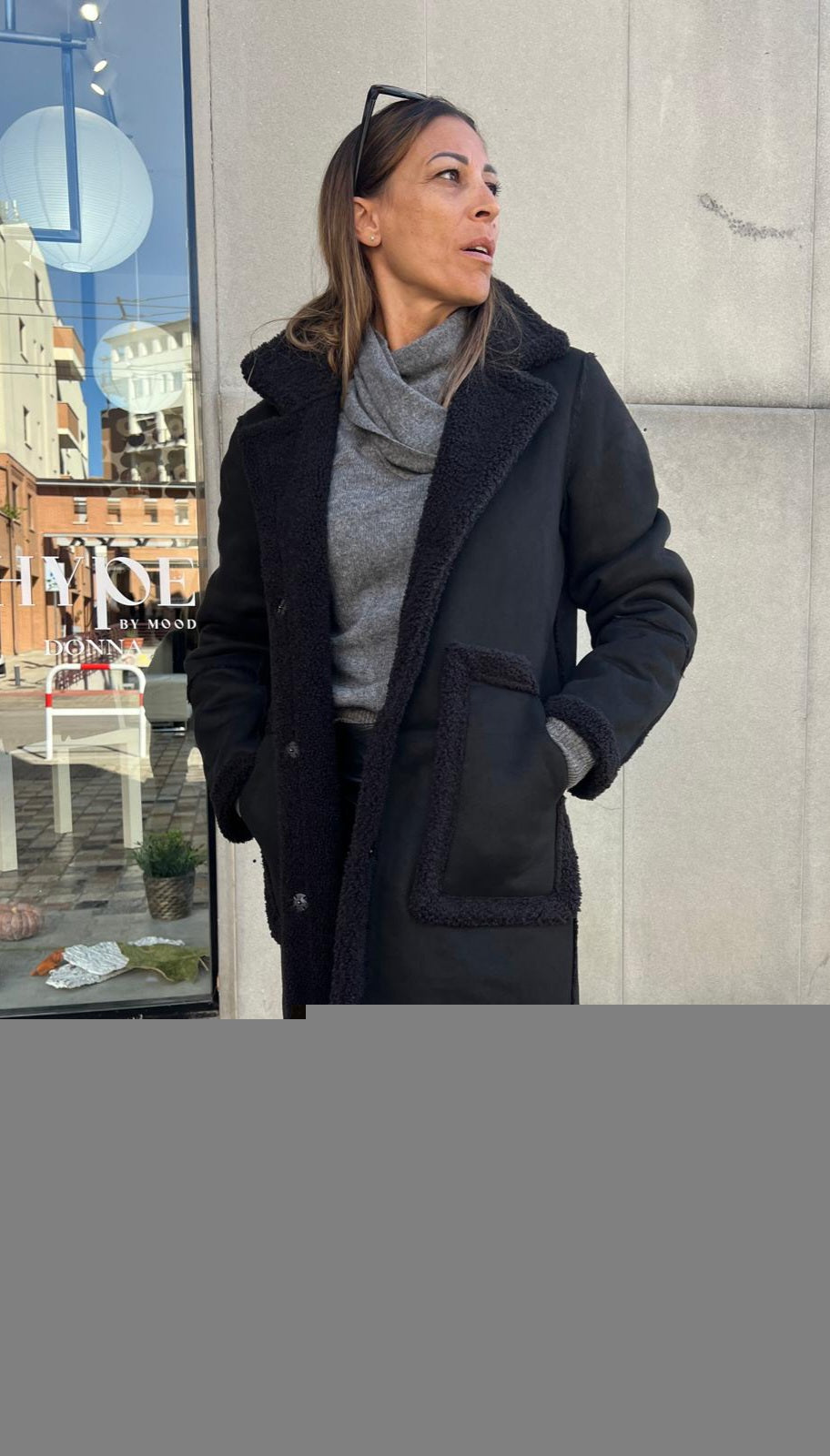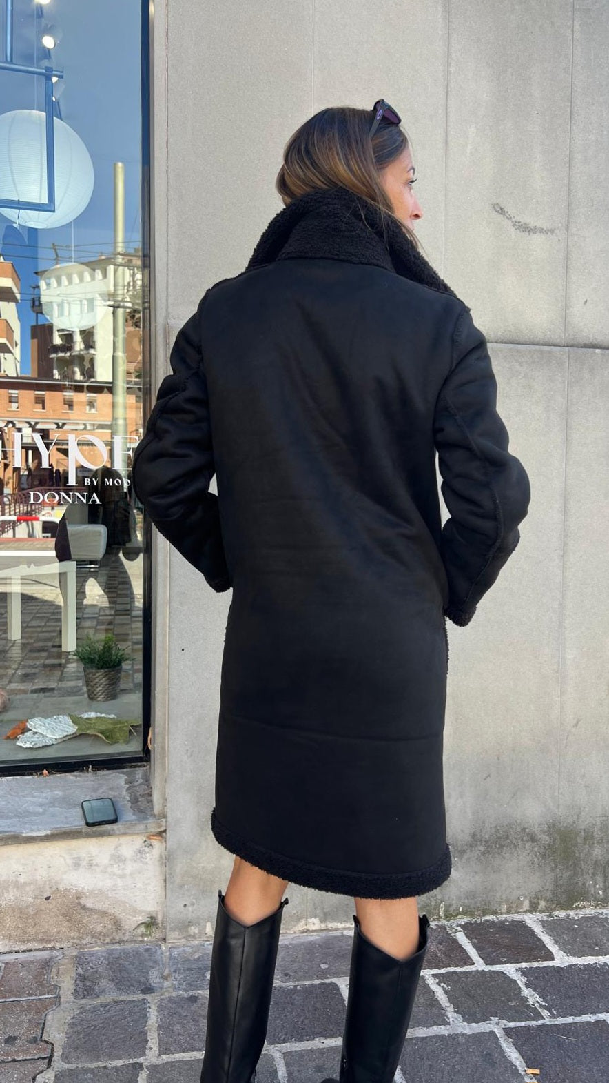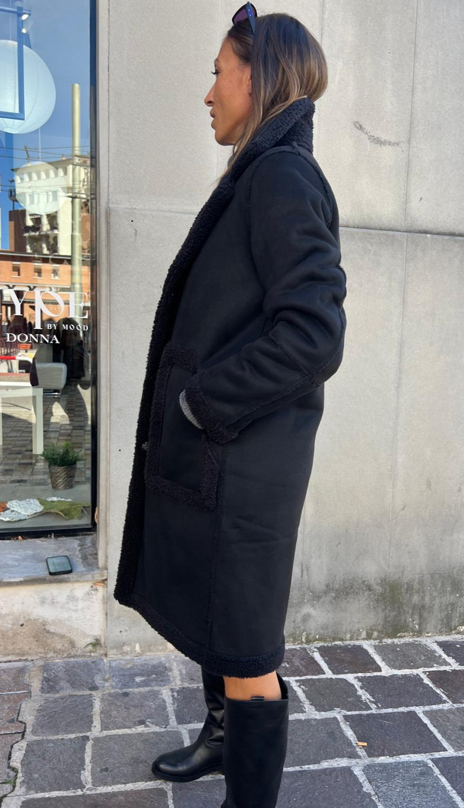 Cappotto double face di lunghezza media, caratterizzato da un lato in finta pelle scamosciata nera con dettagli in ecopelliccia Sherpa nera (come i bordi, i risvolti e la fodera della tasca), che gli conferiscono un aspetto classico da montone. L'altro lato è interamente in morbida ecopelliccia Sherpa nera, creando un cappotto dal look caldo e avvolgente.