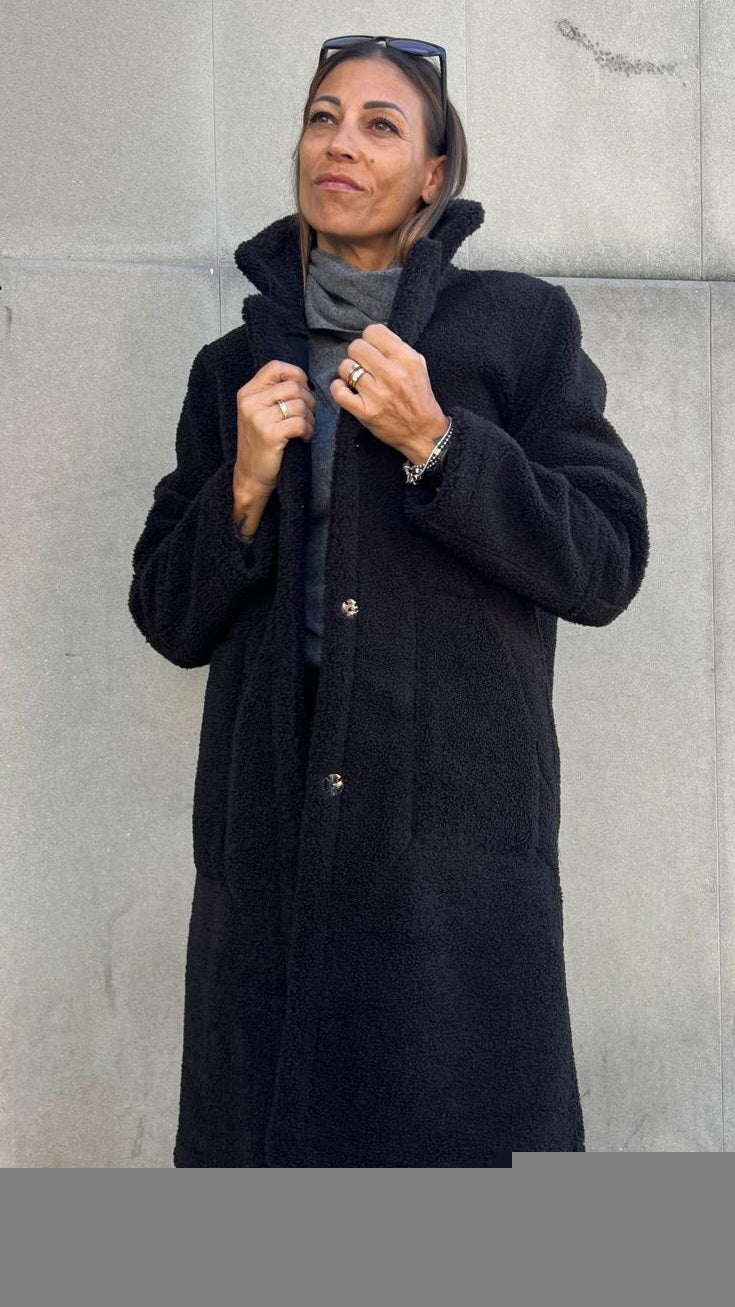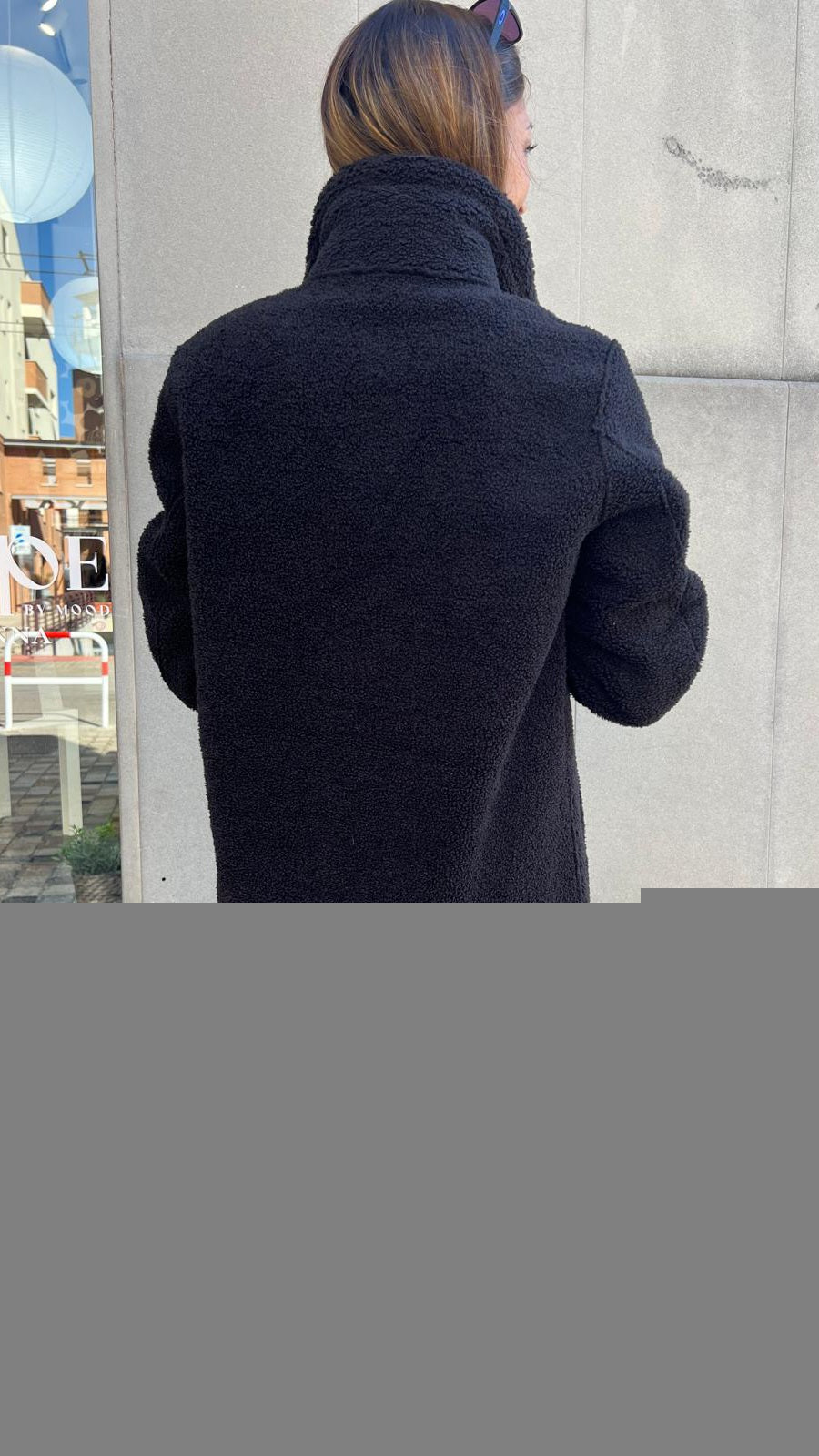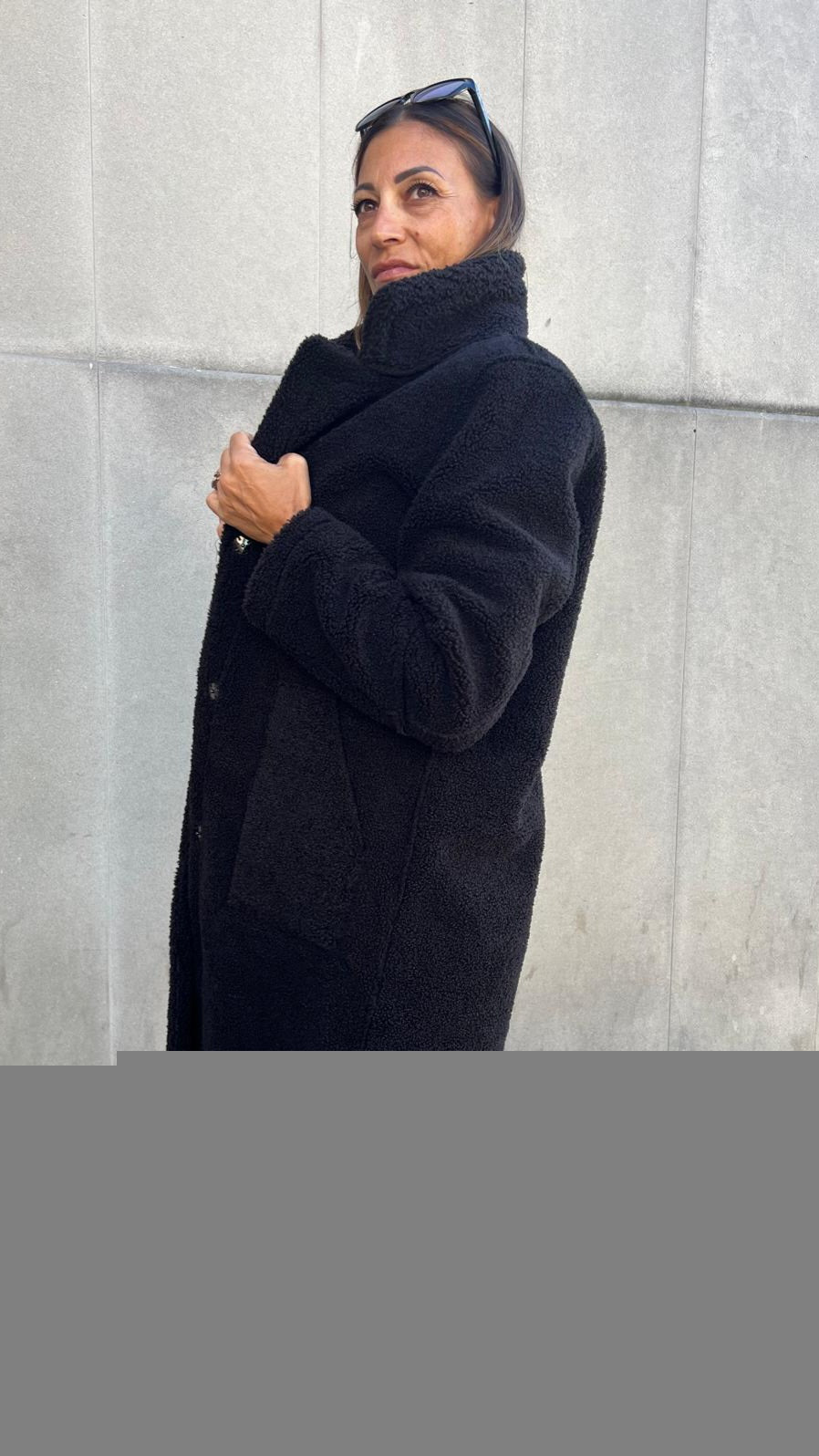Cappotto double face di lunghezza media, caratterizzato da un lato in finta pelle scamosciata nera con dettagli in ecopelliccia Sherpa nera (come i bordi, i risvolti e la fodera della tasca), che gli conferiscono un aspetto classico da montone. L'altro lato è interamente in morbida ecopelliccia Sherpa nera, creando un cappotto dal look caldo e avvolgente.