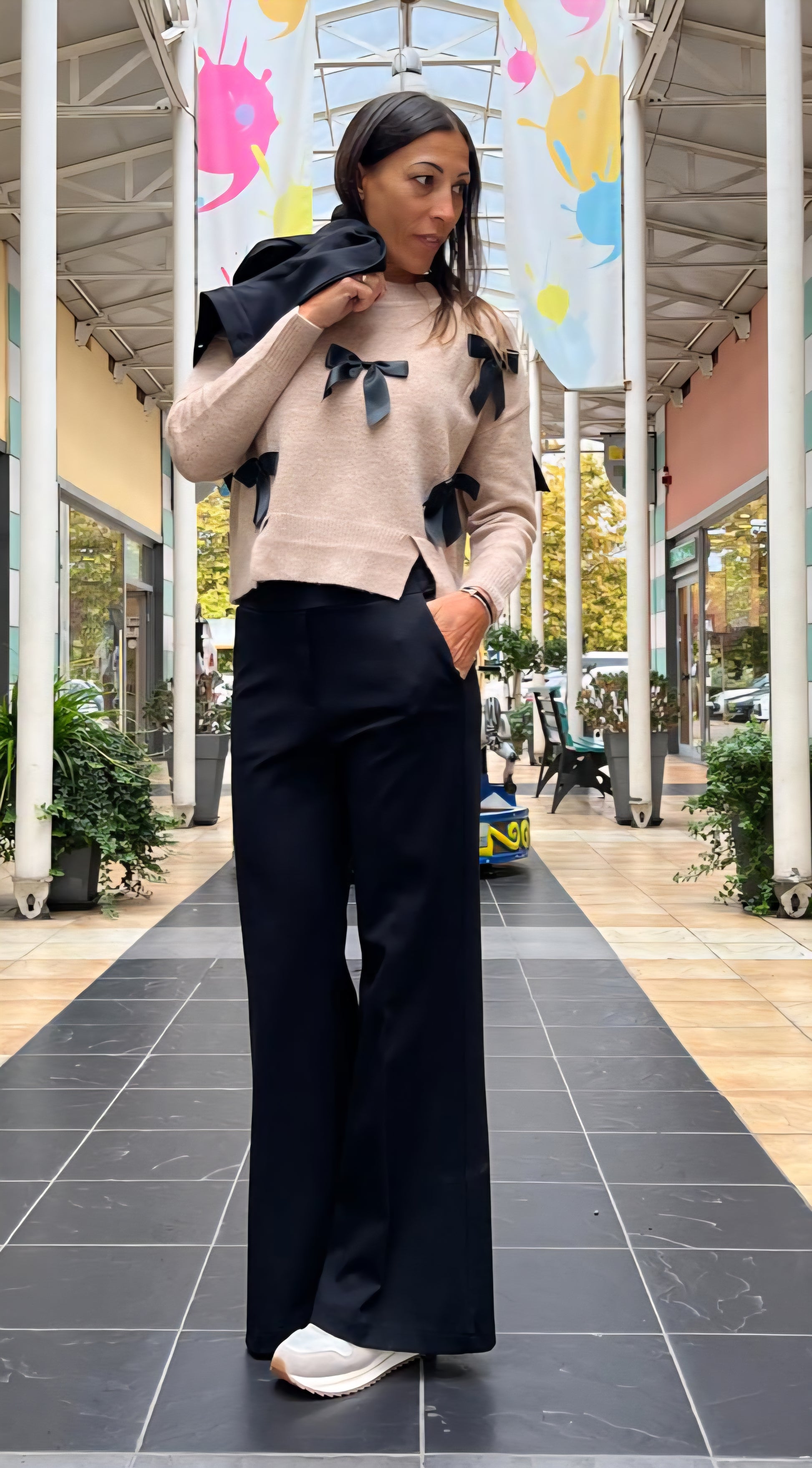 Girocollo soft touch con dettaglio fiocchi e spacchetti sul davanti.