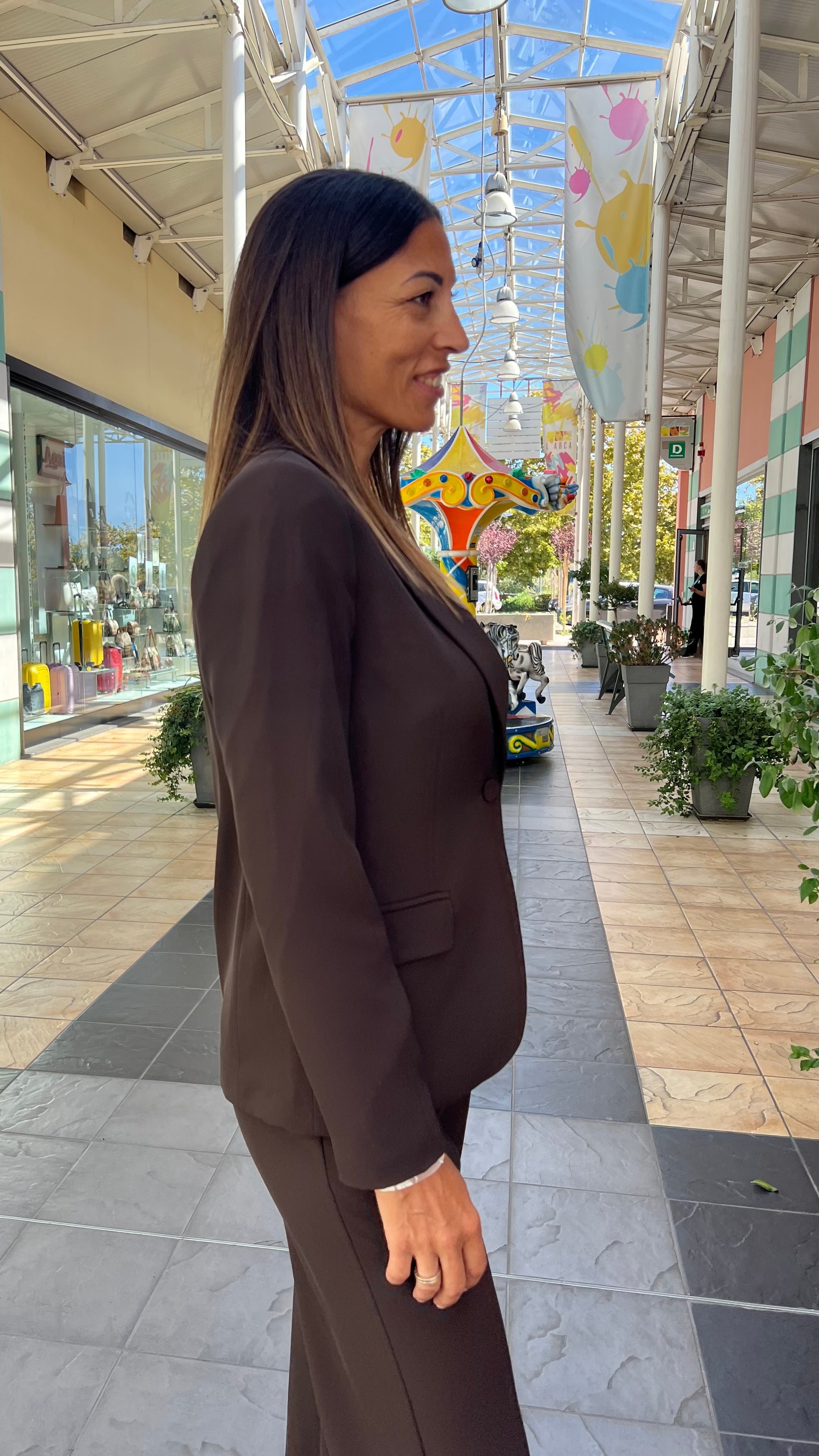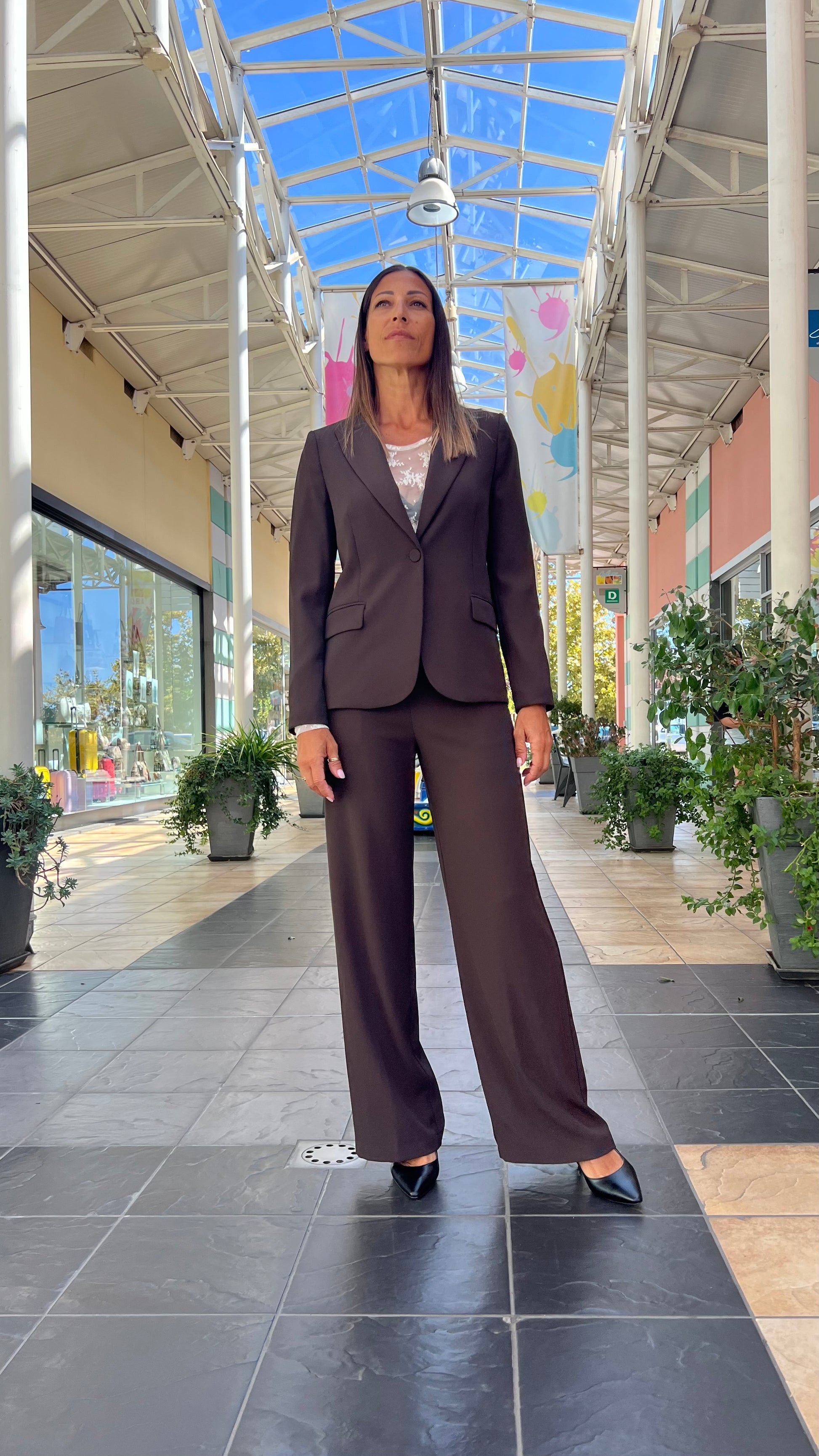Tailleur in tessuto fluido composto da giacca a un bottone , foderata dalla vestibilita morbida e pantalone palazzo con elastico sulla parte del dietro .