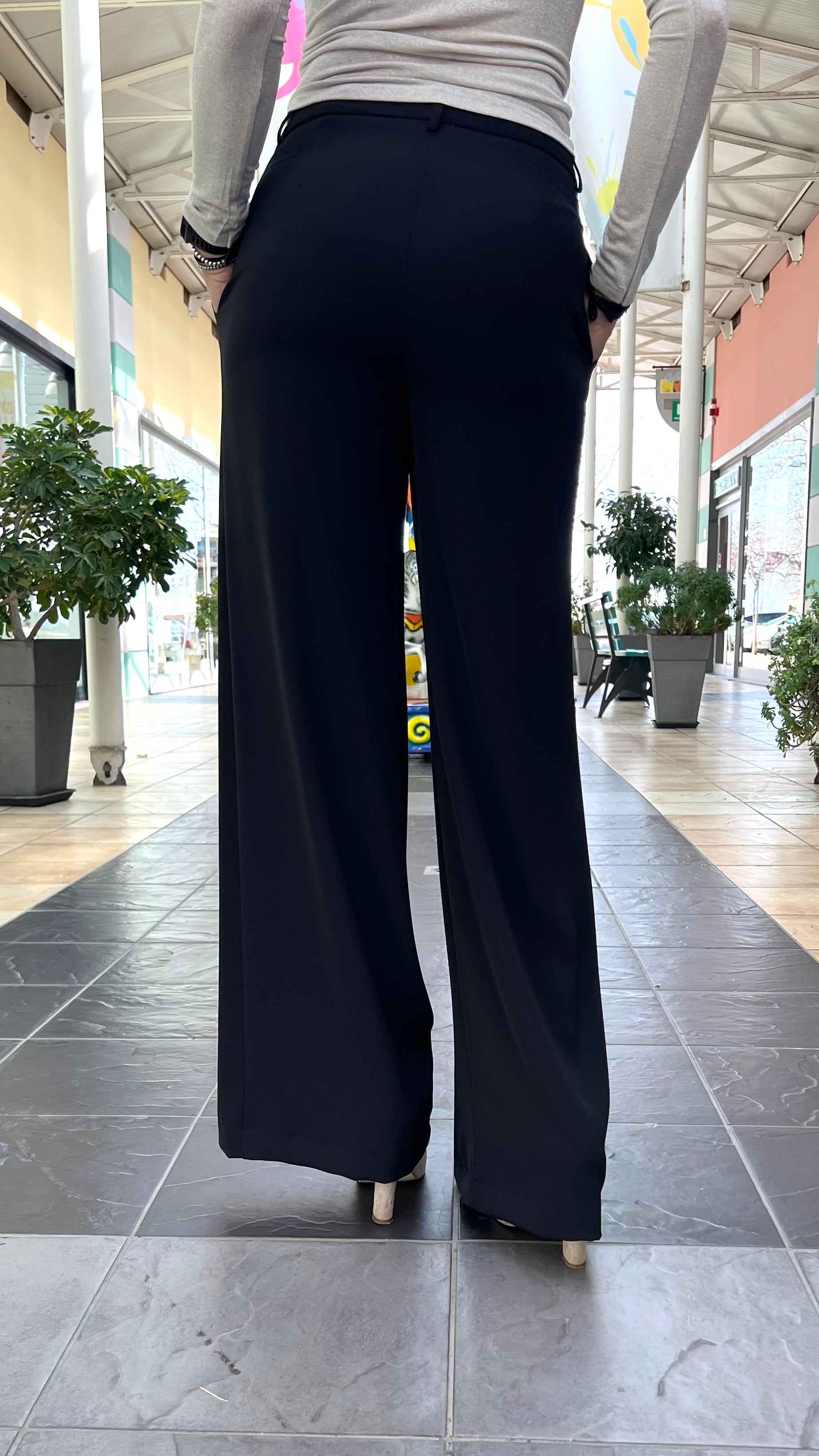 Tailleur composto da giacca morbida sfoderata doppio petto con cinta da legare e pantalone palazzo, chiusura con zip e bottone.